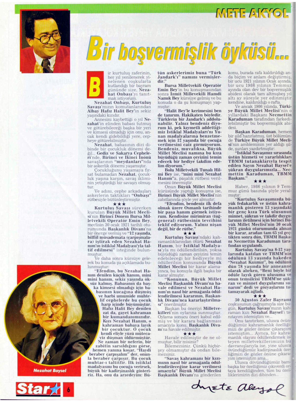 Bir kurtuluş zaferinin, her yıl yenilenerek yi­nelenen coşkularla kutlandığı bir bayram gününde size, Nezahat Onbaşı' tanıt­mak istiyorum. Nezahat Onbaşı, Kurtuluş Savaşı’ mızın komutanlarından Albay Hafız Halit Bey’in sekiz yaşındaki kızıdır. Annesini kaybettiği o yıl Nezahat'ın elinden babası tutmuş ve götürebileceği başka bir yeri ve kimsesi olmadığı için onu, an­cak kendi gidebildiği yere, cep­heye götürebilmiştir. Nezahat, babasının dizi di­binde bir çocukluk dönemi de­ğil Gediz ve Sakarya Cepheleri'nde, Birinci ve ikinci İnönü savaşlarının "meydanları”nda bir askerlik dönemi yaşamıştır. Çocukluğunu yaşamaya fır­sat bulamadan Nezahat, çocuk­luk yaşına karşın, savaş iklimi­nin yetiştirdiği bir savaşçı olmuş­tur. Ve adını, cephe arkadaşları askerlerin taktıkları “Onbaşı” rütbesiyle bütünleştirmiştir. Kurtuluş Savaşı sürerken kurulan Büyük Millet Meclisi”nin Birinci Dönem Bursa Mil­letvekili Operatör Emin Bey, meclisin 30 Ocak 1921 tarihli otu­rumunda Başkanlık Divanı’ na bir önerge vermiş ve “12 yaşında, bilfiil müsademata (çarpışmala­ra) iştirak eden Nezahat Hanım'ın İstiklal Madalyası'yla tal­tif edilmesi" isteğinde bulun­muştur. Ve daha sonra kürsüye gele­rek bu konuda şu açıklamada bu­lunmuştur: “Efendim, bu Nezahat Ha­nım denilen küçük hanım, mini mini hanım, sekiz yaşında ök­süz kalmış. Babasının da baş­ka kimsesi olmadığı için ba­basının kucağına düşmüş ve harbi umumide muhte­lif cephelerde bu çocuk harp içinde büyümüştür. Hafız Halit Bey denilen zat da, gayet kahraman bir kumandanımızdır. Kızı Nezahat Hanım, o kahraman babaya layık bir çocuktur. 6 çocuk kendi eliyle yüzü müteca­viz düşman öldürmüştür. Ne zaman bir neferin, bir zabitin sarsıldığını görse, hemen yanına koşar, "Haydi beraber çarpışalım" der, onun­la beraber çarpışır. Bu çocuk muhtac-ı taltiftir. İlk istiklal madalyasını bu çocuğa verirsek, büyük bir kadirşinaslık gösteri­riz. Ha, onu da arzedeyim: Bütün­ askerlerimiz buna “Türk Jandark’ı" namını vermişler­dir.” Bursa Milletvekili Operatör Emin Bey’ in bu konuşmasından sonra İzmit Milletvekili Hamdi Namık Bey kürsüye gelmiş ve bu konuda o da şu konuşmayı yap­mıştır: "Halit Bey'le kerimesini ben de tanırım. Hakikaten böyledir. Türklerin bir Jandark'ı addolu­nabilir. Yalnız bendeniz diyo­rum ki, pek kıymetli addettiği­miz İstiklal Madalyaları'nı Yu­nan madalyalarına benzetme­mek için 12 yaşında bir çocuğa verilmesini caiz görmüyorum. Bendeniz, muvafıksa, Büyük Millet Meclisi namına bu kıza büyüdüğü zaman çeyizini temin edecek bir hediye takdim ede­lim diyorum." Bolu Milletvekili Tunalı Hil­mi Bey ise, “mini mini Nezahat Hanım”a, paşalık rütbesi veril­mesini önermiştir. Onun Büyük Millet Meclisi kürsüsünde yaptığı konuşma ise, Birinci Büyük Millet Meclisi’ nin zabıtlarında şöyle yer almıştır: "Efendim, bendeniz ilk defa olmak üzere Osmanlı tarihinde bir paşa hanım görmek istiyo­rum. Kendisine mirimiran (tuğ­general) rütbesinin tevcihini teklif ediyorum. Yalnız nişan değil, bir de rütbe.” Kurtuluş Savaşı’ ndaki kah­ramanlıklarından ötürü Nezahat Hanım, bir İstiklal Madalya­’yla mı ödüllendirilsin, yoksa büyüdüğü zaman çeyizini temin edebileceği bir hediyeyle mi ödüllendirilsin konusunda Büyük Millet Meclisi bir karar alama­yınca, bu konuyla ilgili başka bir karar almıştır. “Konunun, Büyük Millet Meclisi Başkanlık Divanı’ na ha­vale edilmesi ve Nezahat Hanım’ın nasıl bir armağanla ödül­lendirilmesi kararının, Başkan­lık Divanı'nca kararlaştırılma­sı" önerilmiştir. Başkan bu öneriyi Milletve­killeri’ nin oylarına sunmuştur. Oylama sonucu öneri kabul edil­miş ve bir karara bağlanması amacıyla konu Başkanlık Divanı'na havale edilmiştir. Havale edilmiştir de ne ol­muştur, bilir misiniz? Bilemezsiniz. Çünkü hiçbirşey olmamıştır da ondan bilemezsiniz. “Savaş kahramanı bir kızı­mızın nasıl bir armağanla ödül­lendirileceğine karar verilmesi amacıyla "Büyük Millet Meclisi Başkanlık Divanı” na gönderilen konu, burada rafa kaldırıldığı an­da biçim ve anlam değiştirmiş, bir ucu 1921 yılının Ocak ayında, bir ucu 1986 yılının  Temmuz ayında olan dev bir boşvermişlik abidesi olarak tam altmışbeş yıl altı ay süreyle yer edinmiştir kendine, kaldırıldığı o rafta. Ve ancak 1986 yılında, Türki­ye Büyük Millet Meclisi’ nin o yıllardaki Başkanı Necmettin Karaduman tarafından farkedilebilmiştir bu boşvermişlik abi­desi. Başkan Karaduman, hemen bir şild hazırlatmış, üst bölümün­de Türkiye Büyük Millet Meclisi'nin ambleminin yer aldığı şil­de, şunları yazdırtmıştır: "İstiklal Savaşımız sırasında üstün hizmeti ve yararlılıkları TBMM tutanaklarıyla tespit edilen Sayın Nezahat Baysel'e şükran duygularımızla... Nec­mettin Karaduman, TBMM Başkanı.” Haber, 1986 yılının 9 Temmuz günü basında şöyle yeralmıştır: "Kurtuluş Savaşımızda büyük fedakarlık ve üstün kahramanlık gösteren 13 yaşındaki bir genç kıza Türk ulusunun minnet, şükran ve takdir duygu­larının iletilmesi için birinci Bü­yük Millet Meclisi’nin 30 Ocak 1921 günkü oturumunda alınan bir karar, aradan tam 65 yıl geç­tikten sonra dün, TBMM Başka­nı Necmettin Karaduman tara­fından uygulandı. Kurtuluş Savaşı'na 8-12 yaş­larında katılan ve TBMM’nin ödülünü 13 yaşında hakeden "Nezahat Kızımız", bu ödülünü dün 78 yaşında bir anneanne olarak alırken, "Beni böyle bir ödüle layık gören ulusuma ve onun temsilcisi TBMM'ne şük­ran ve minnet duygularımı sunarım" dedi ve gözyaşlarını tutamayarak ağla