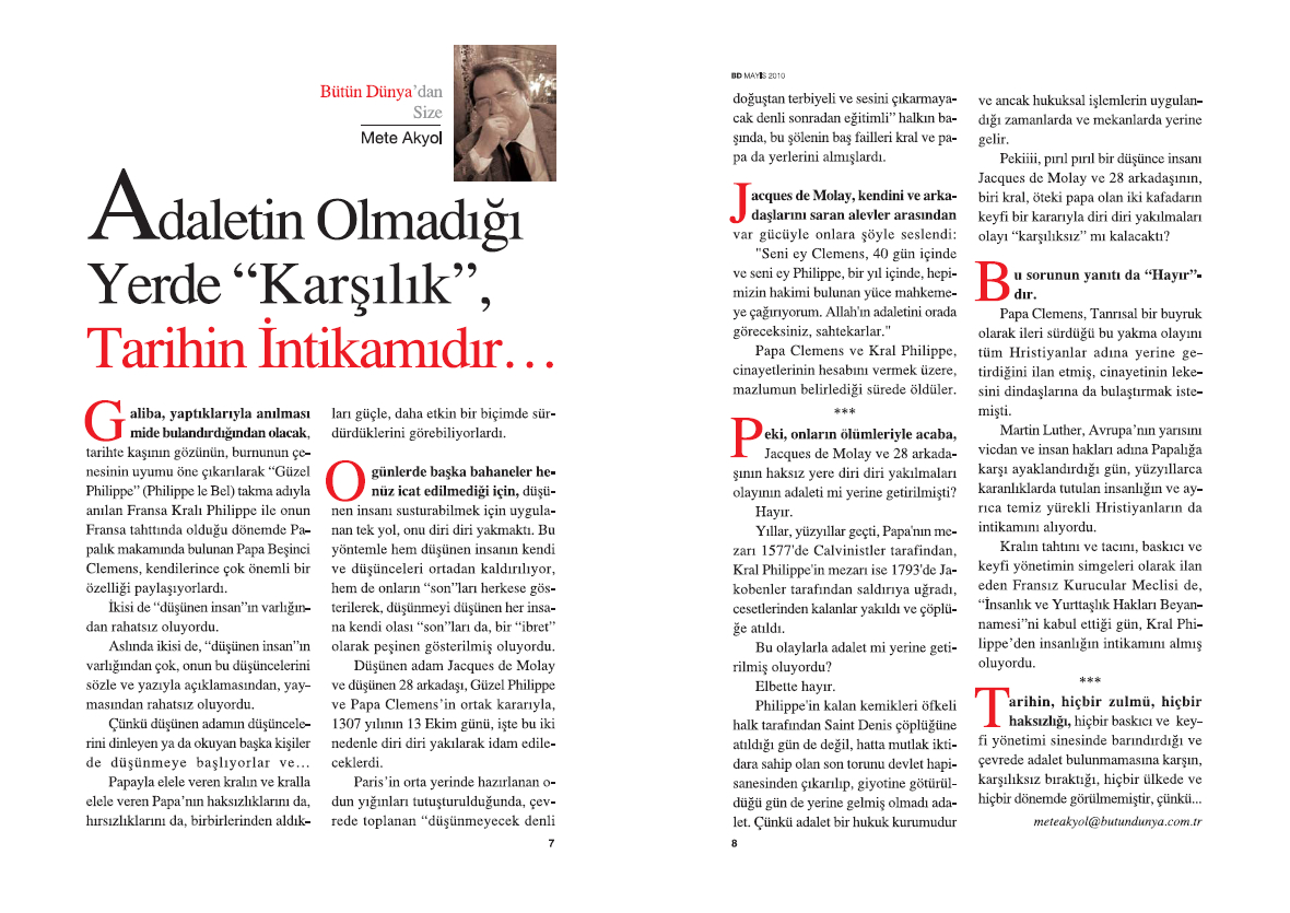 Pekiiii, pırıl pırıl bir düşünce insanı Jacques de Molay ve 28 arkadaşının, biri kral, öteki papa olan iki kafadarın keyfi bir kararıyla diri diri yakılmaları olayı “karşılıksız” mı kalacaktı?