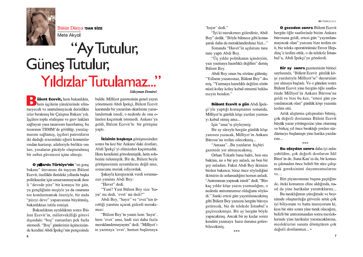 Orhan Tokatlı bana baktı, ben ona baktım, ne o bir şey anladı, ne ben bir şey anladım. Fakat Abdi Bey ikimize birden bakınca, biraz önce söylediğini ikimizin de anlamadığını hemen anladı. “Antrenman yapmak istedi” dedi. “Birkaç yıldır köşe yazısı yazmadığını, o nedenle antrenmansız olduğunu söyledi.” Sanki ertesi gün yayımlanacakmış gibi Bülent Bey yazısını her gün büroya getirecek, biz de teleksle İstanbul’a geçirecekmişiz. Bir ay her gün böyle yapacakmış. Ancak bir ay kadar sonra kendini yazmaya hazır duruma getirebilecekmiş.