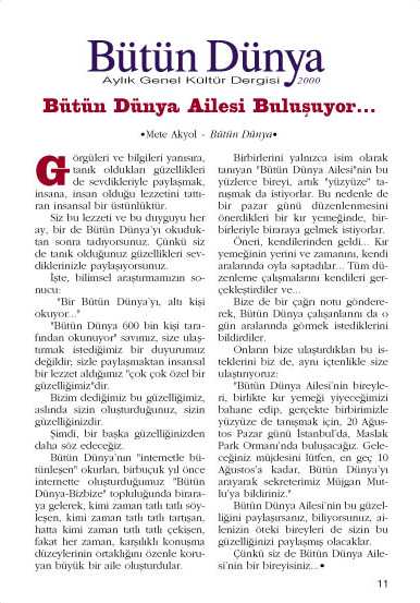 "Bütün Dünya Ailesi'nin bireyleri, birlikte kır yemeği yiyeceğimizi bahane edip, gerçekte birbirimizle yüzyüze de tanışmak için, 20 Ağustos Pazar günü İstanbul'da, Maslak Park Ormanı'nda buluşacağız. Geleceğiniz müjdesini lütfen, en geç 10 Ağustos'a kadar, Bütün Dünya'yı arayarak sekreterimiz Müjgan Mutlu'ya bildiriniz."