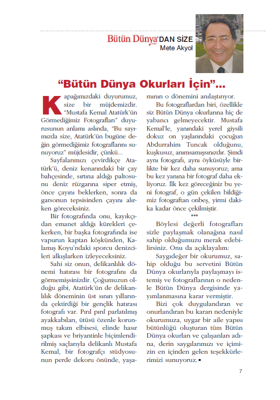 Kapağımızdaki duyurumuz, size bir müjdemizdir. “Mustafa Kemal Atatürk’ün Görmediğimiz Fotoğrafları” duyurusunun anlamı aslında, “Bu sayımızda size, Atatürk’ün bugüne değin görmediğimiz fotoğraflarını sunuyoruz” müjdesidir, çünkü…