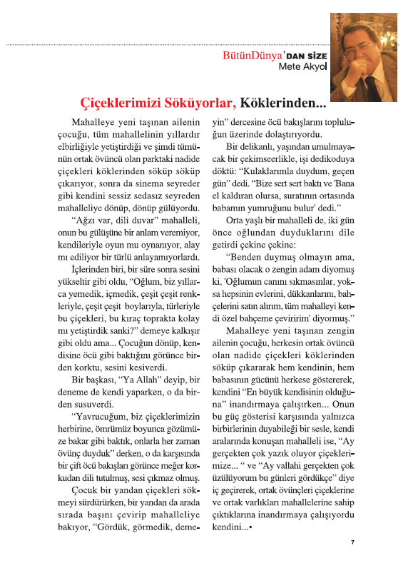 İçlerinden birisi, bir süre sonra sesini yükseltir gibi oldu, “Oğlum, biz yıllarca yemedik, içmedik, çeşit çeşit renkleriyle, çeşit çeşit boylarıyla, türleriyle bu çiçekleri, bu kıraç toprakta kolay mı yetiştirdik sanki?” demeye kalkışır gibi oldu ama… Çocuğun dönüp, kendisine öcü gibi baktığını görünce birden korktu, sesini kesiverdi.
