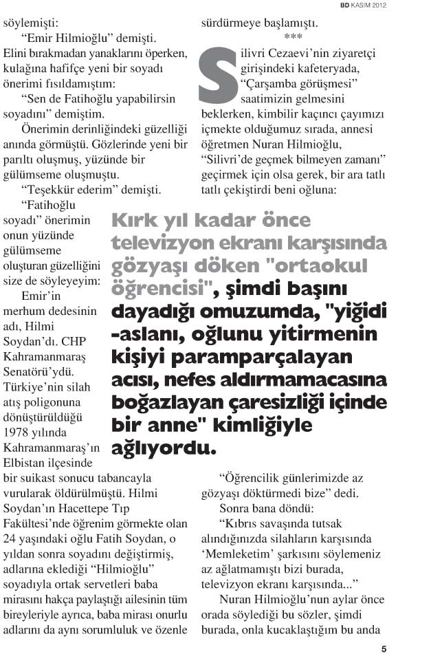 Silivri Cezaevi’nin ziyaretçi girişindeki kafeteryada, “Çarşamba görüşmesi” saatimizin gelmesini beklerken, kimbilir kaçıncı çayımızı içmekte olduğumuz sırada, annesi öğretmen Nuran Hilmioğlu, “Silivri’de geçmek bilmeyen zamanı” geçirmek için olsa gerek, bir ara tatlı tatlı çekiştirdi beni oğluna: