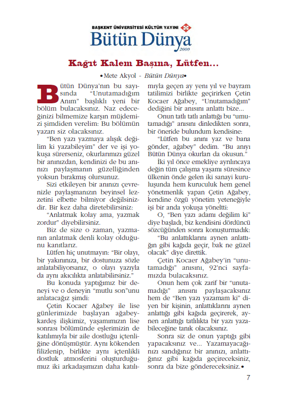 Bütün Dünya’nın bu sayısında “Unutamadığım Anım” başlıklı yeni bir bölüm bulacaksınız. Naz edeceğinizi bilmemize karşın müjdemizi şimdiden verelim: Bu bölümün yazarı siz olacaksınız.