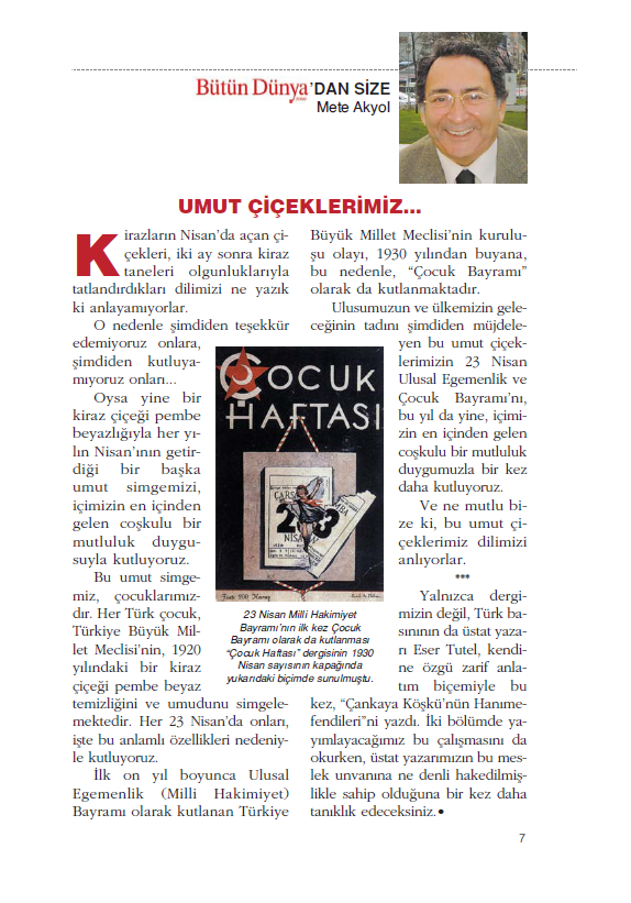 Bu umut simgemiz, çocuklarımızdır. Her Türk çocuk, Türkiye Büyük Millet Meclisi’nin, 1920 yılındaki bir kiraz çiçeği pembe beyaz temizliğini ve umudunu simgelemektedir. Her 23 Nisan’da onları, işte bu anlamlı özellikleri nedeniyle kutluyoruz.