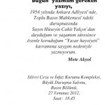 Bu sayfada “bugün” yazmam gereken yazıyı, 1954 yılında Ankara Adliyesi’nde, Toplu Basın Mahkemesi’ndeki duruşmasında Sayın Hüseyin Cahit Yalçın’dan duyduğum ve yaşamım süresince özenle koruduğum “Yazar haysiyeti” kavramına saygım nedeniyle yazmıyorum. Mete Akyol Silivri Ceza ve İnfaz Kurumu Kompleksi, Büyük Duruşma Salonu, Basın Bölümü, 27 Temmuz 2012, Saat: 18.45